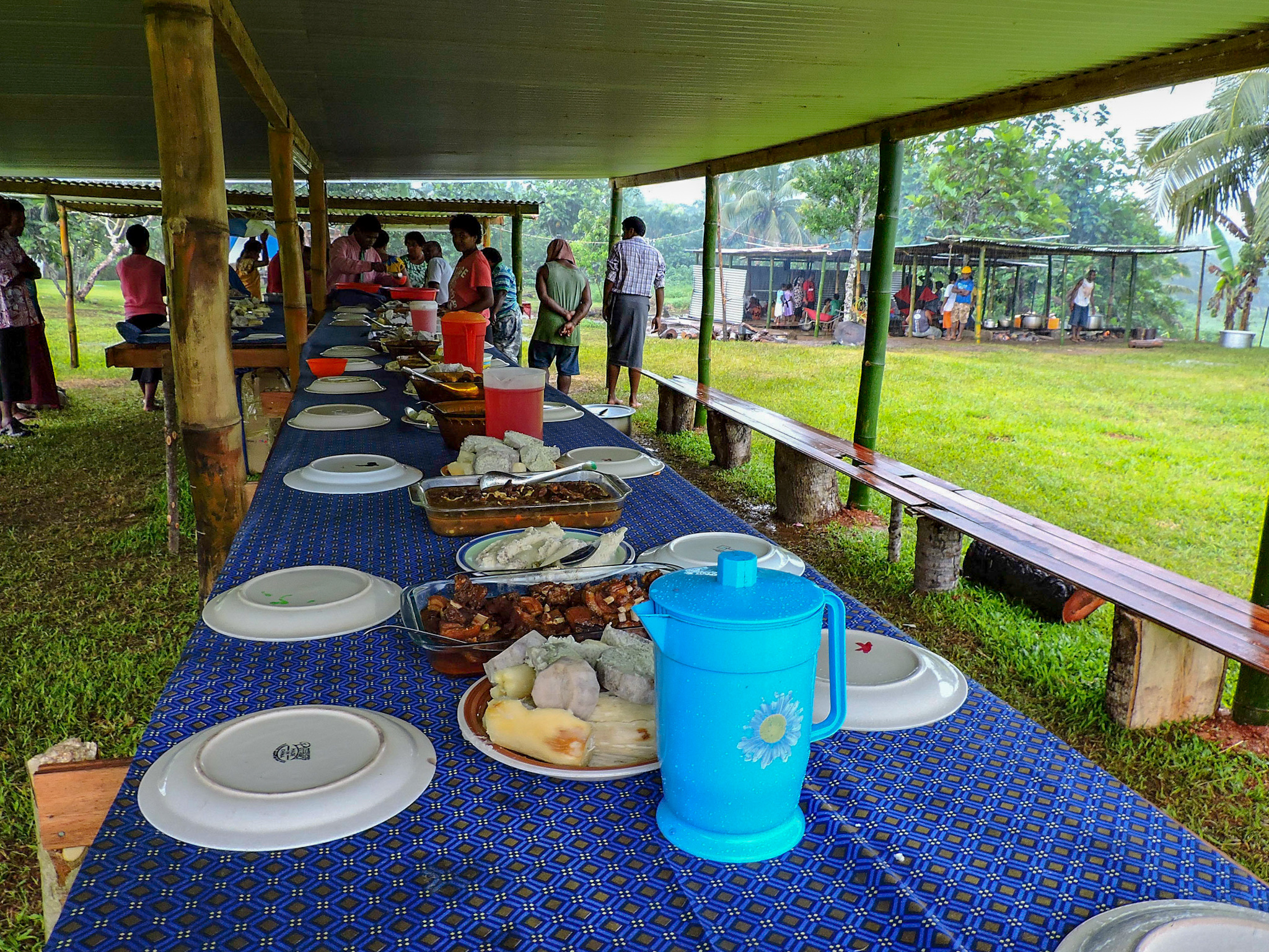 Кварталчето с църквичката на Том Мосес е обособено като отделно село и е кръстено с причудливото име Вюнбонбон (Vunbongbong), означаващо “Под бонбоновото дърво”. Продължавам покрай футболен стадион и игрище за волейбол към главното село Мелип. Залутвам се сред приказните палмови къщички с мангови дървета и кокошчици, ровещи из пясъка. Всички хора поздравяват приветливо с широки усмивки. Попадам и на накамала, където мъжете вече търпеливо са се подредили за кава церемонията. Поздравявам всички с ръкостискане, но учтиво отказвам поканата да се присъединя към тях.
